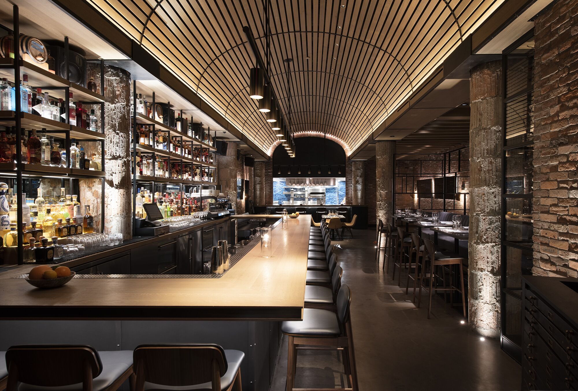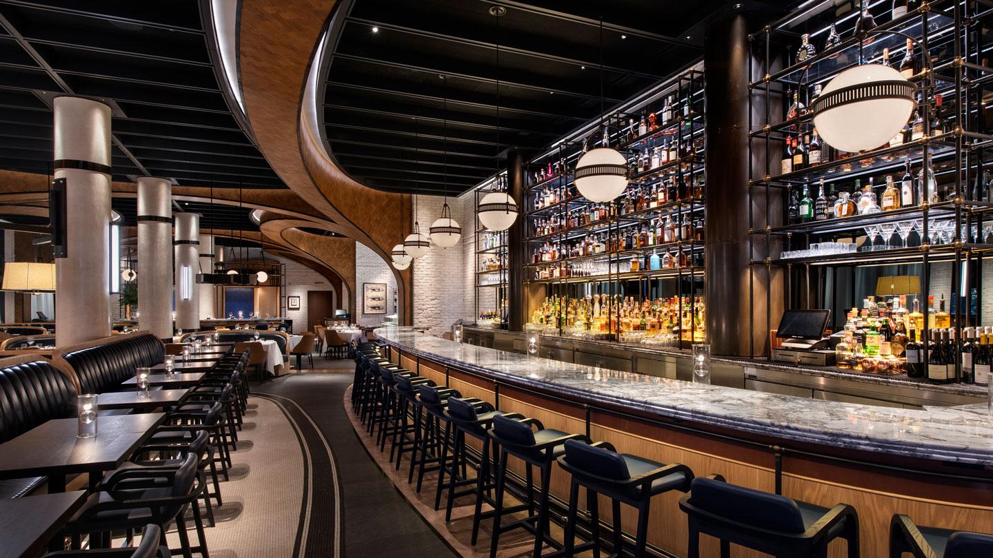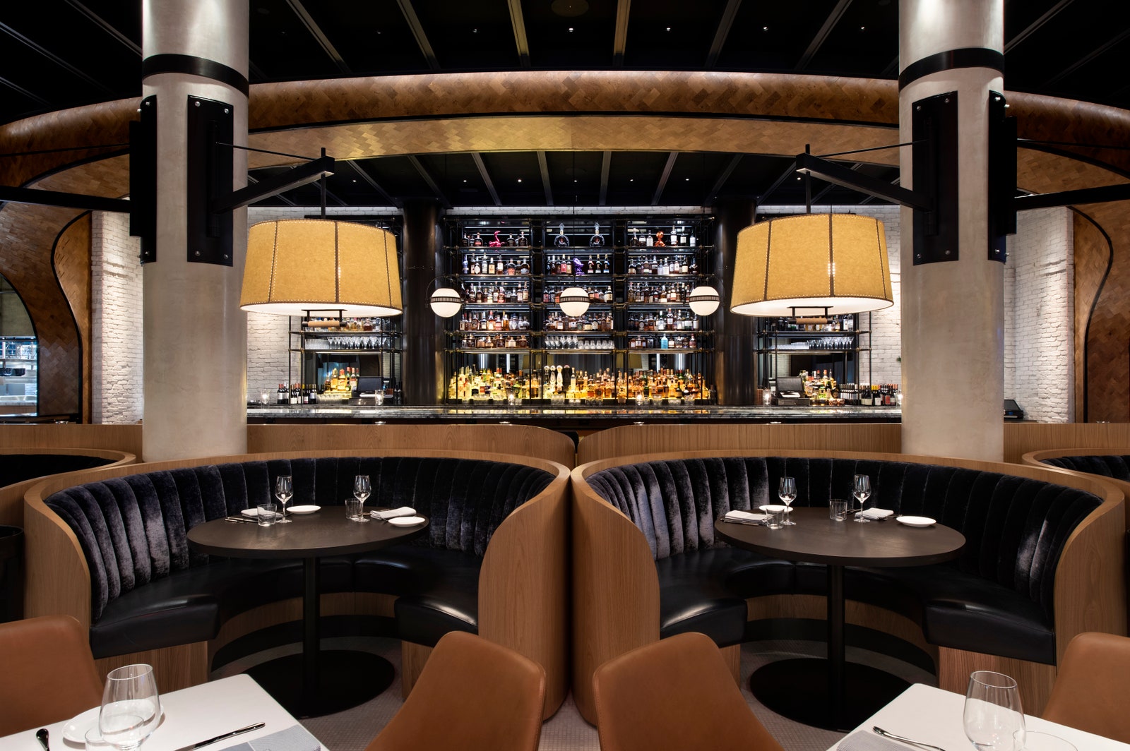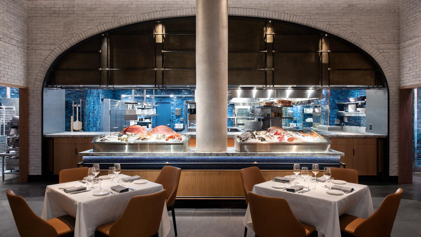 Perched on Park Avenue, Oceans is a raw bar and a restaurant with an elegant material palette. In addition to the undulating wood-rib ceiling and whitewashed brick walls, the banquettes and barstools in our dusky-hued Chamonix Glace add lovely contrast to the refined interiors.