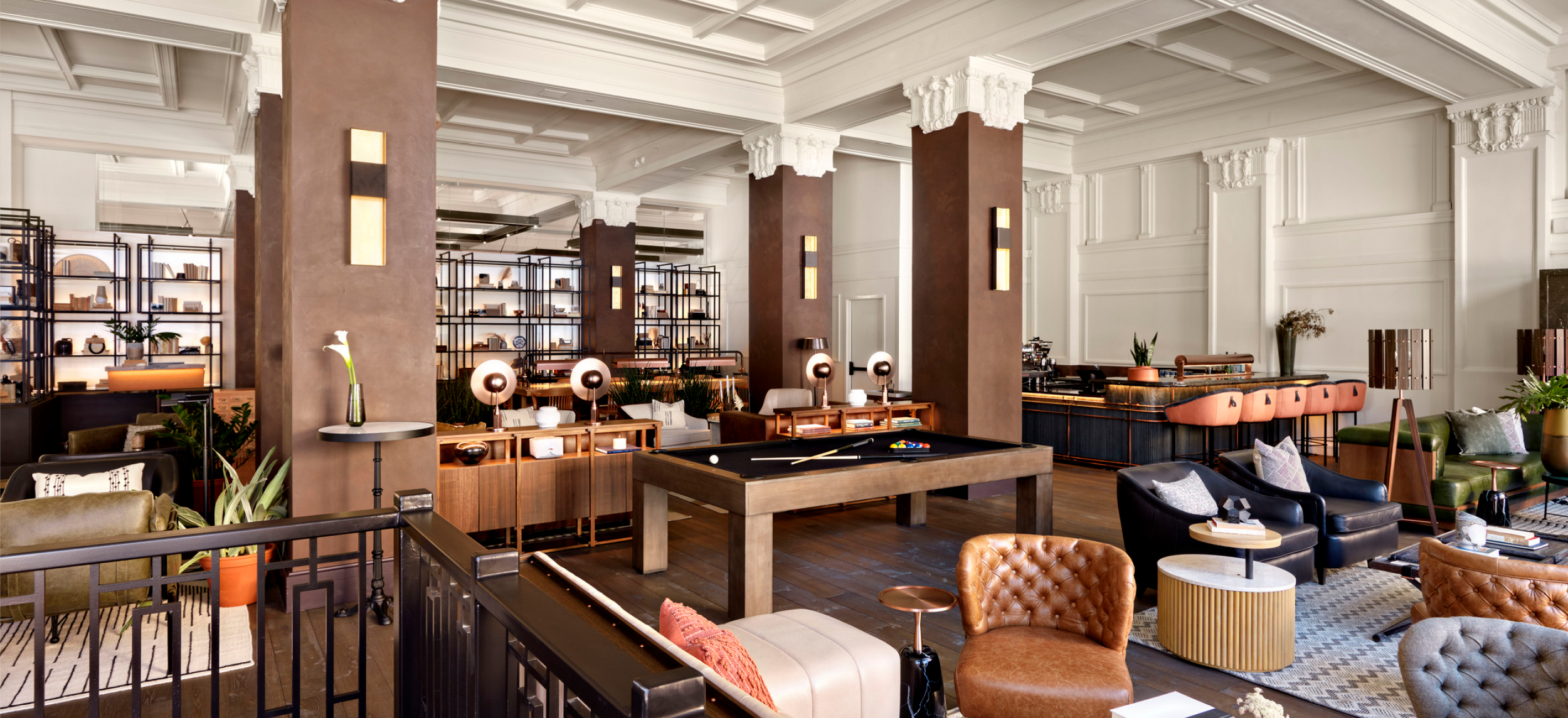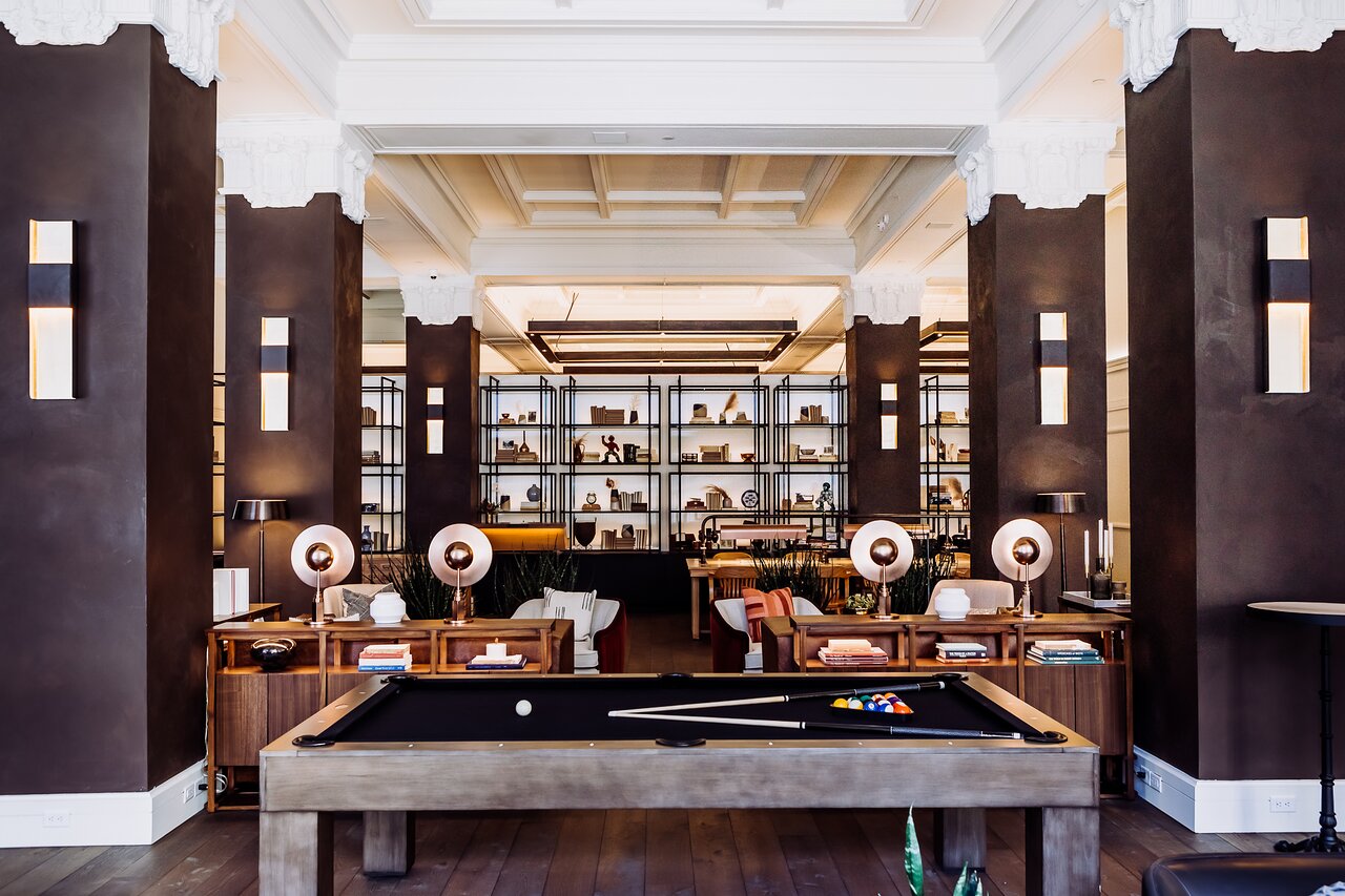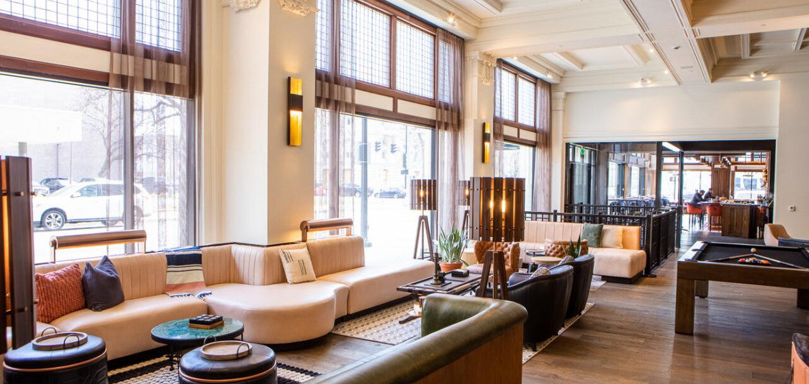Midcentury modern meets contemporary artistry in Des Moines, Iowa's Surety Hotel. The leather-clad lobby chairs and sofas feature a spectrum of Tiger Leather articles, including Sierra Jute Brown, Montana Timberline Green and Chamonix Glace, just to name a few.