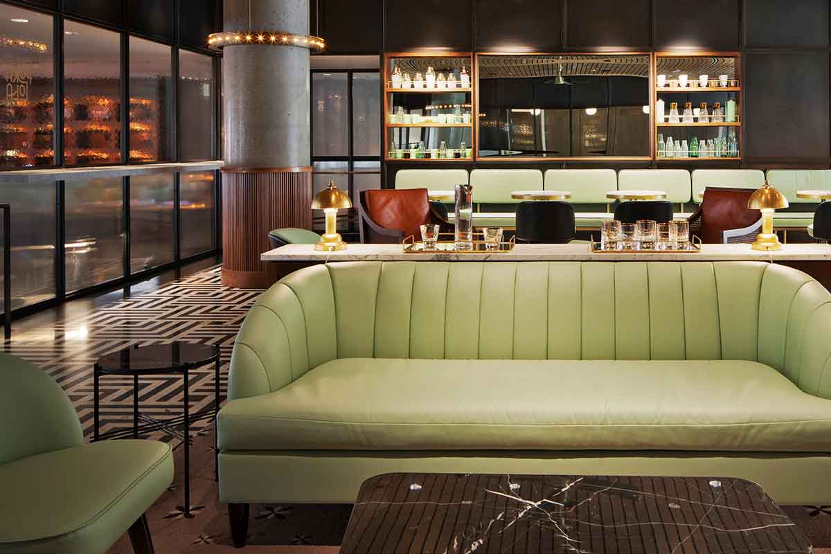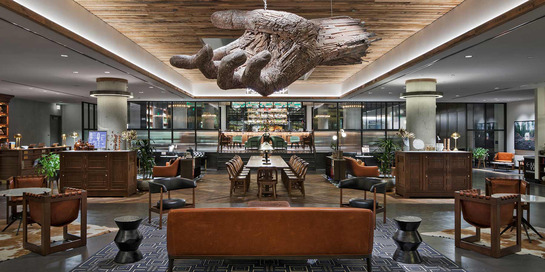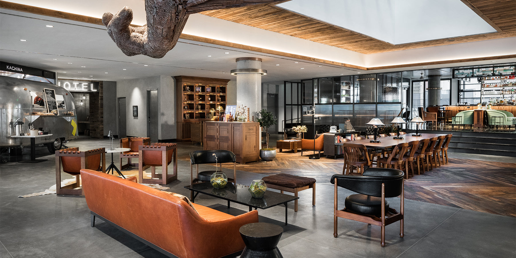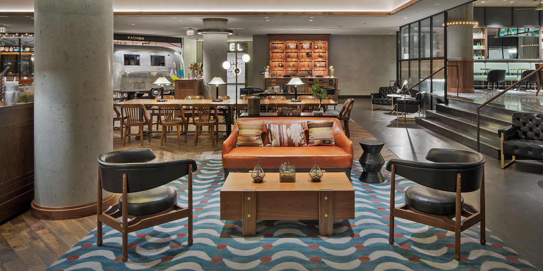 The interior of this eight-story hotel uses a distinct palette of industrial materials that give the space an urban, loft feel. Tiger Leather outfitted many of the common area furnishings, including select sofas, chairs, and booth seating in the adjacent Kachina Cantina and Poka Lola Social Club.