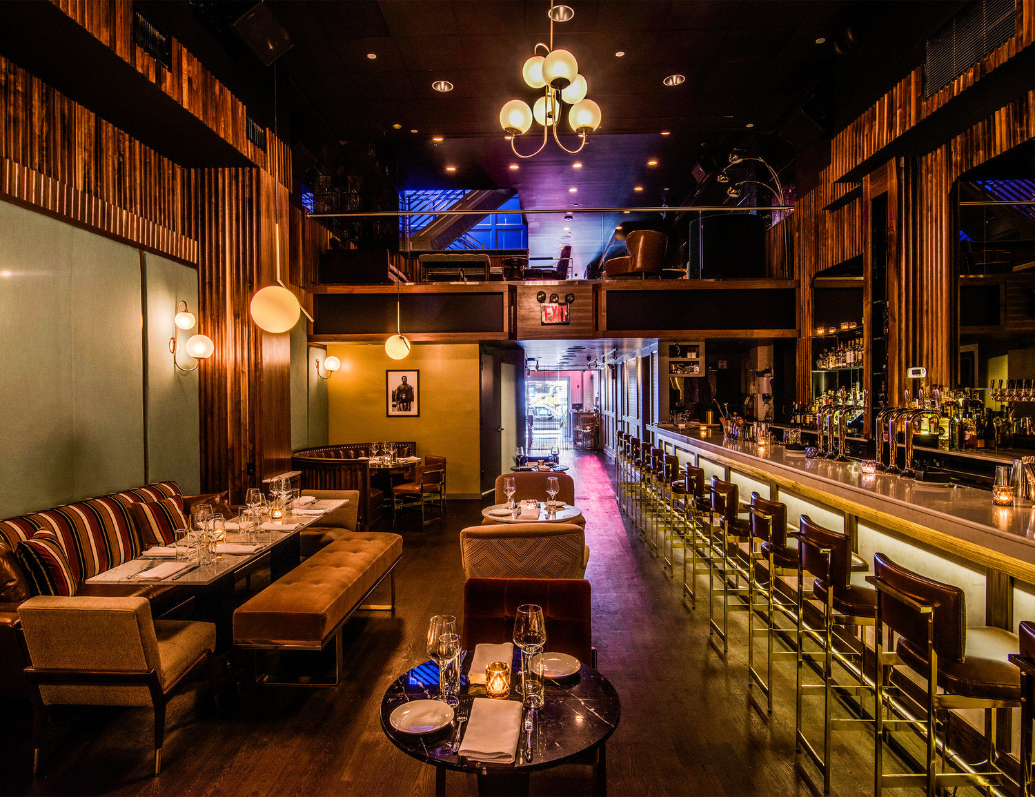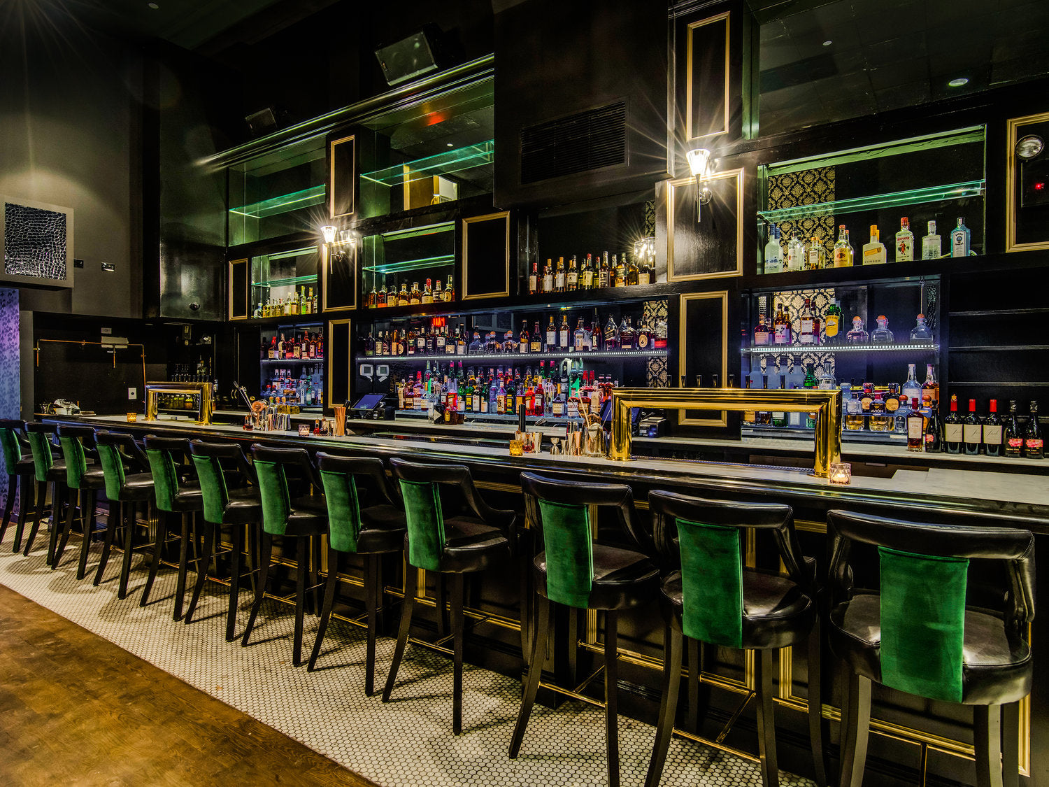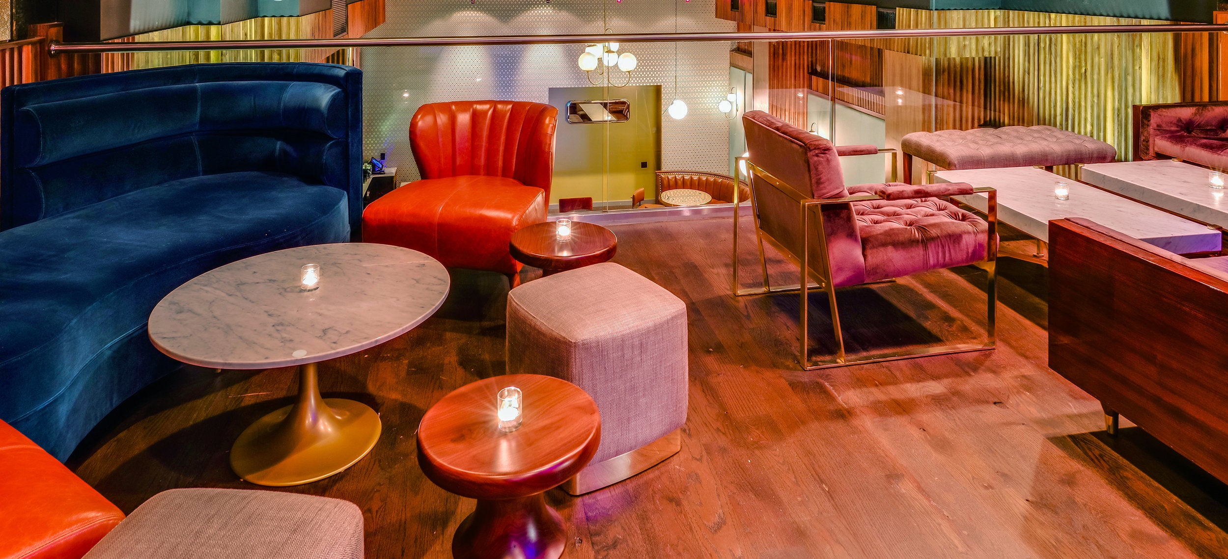 The 70s are on full display at The Vnyl, a multi-purpose space which feels residential while still having the functionality of a restaurant, event space and club. Colorful splashes abound, offset by leather-clad chairs, banquettes and barstools upholstered in fine Italian leather by Tiger.