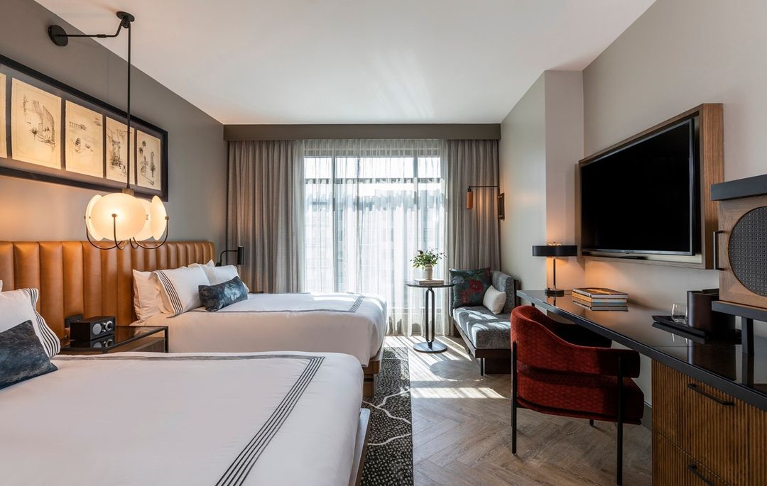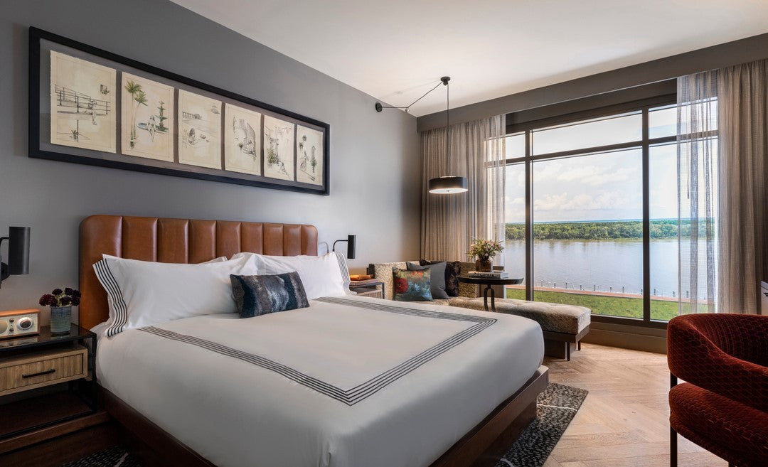 The botanical - inspired aesthetic of this luxury hotel combines historic architecture with contemporary style. In the guest rooms, this tufted headboard in Tiger Leather Sierra adds a pop of warmth and contrast to the neutral painted walls and delicate bedding.