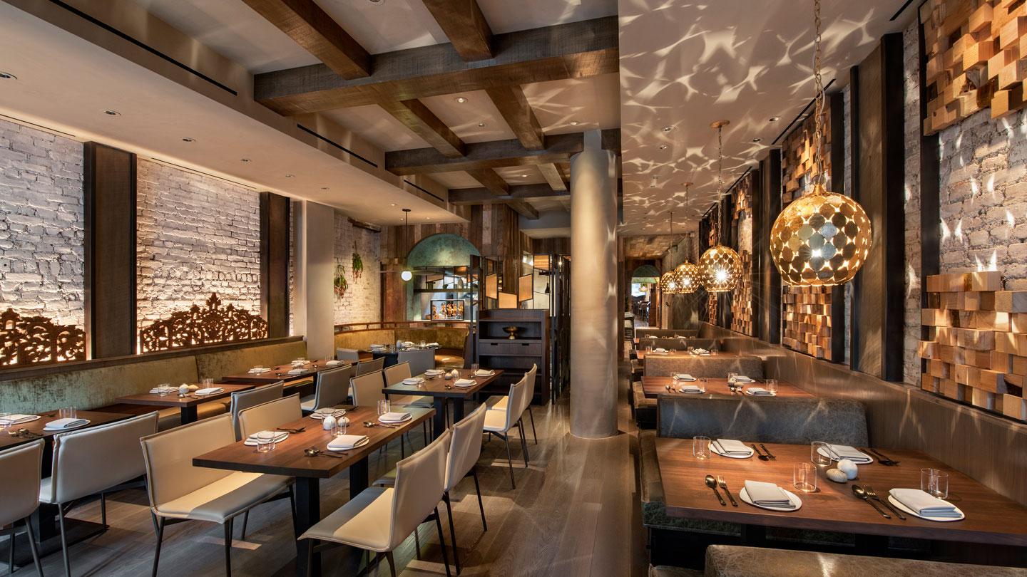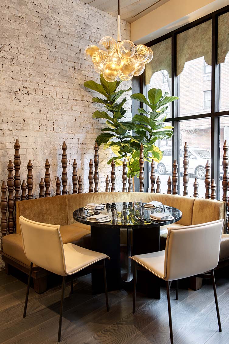 These Belmont Slate barstools, Sierra Bastille dining chairs and Montana Timberline Green booths feel right at home among the teak paneling and whitewashed brick walls of this charming Manhattan brasserie serving Indonesian cuisine with a modern French flair.